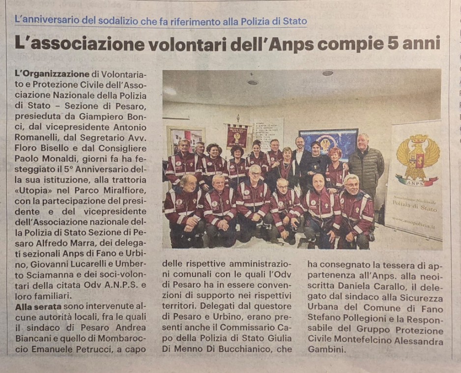 oggi svolta “In questo primo quinquennio, oltre ad essere cresciuti numericamente con gli attuali 24 volontari, abbiamo svolto attività di Protezione Civile, valorizzazione del patrimonio storico e artistico, promozione della cultura della legalità, dell’educazione civica, dell’istruzione e della formazione professionale, collaborando in convenzione con i Comuni di Pesaro e Mombaroccio ed altri di questa Provincia. A breve inizierà anche una collaborazione con il Comune di Fano. L’O.d.V. fonda la propria azione sulla operosità dei propri soci, provenienti sia dalle Forze di Polizia, nonché dalla vita Civile che condividono gli ideali e i valori della Polizia di Stato e dell’A.N.P.S. stessa, con l’univoco intento di svolgere con orgoglio attività in favore della comunità e del bene comune, mettendo a disposizione il proprio