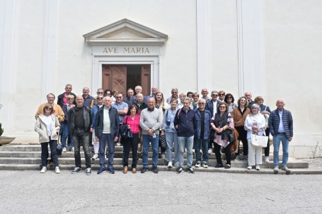 la Chiesetta venne costruita in epoca post rinascimentale sopra al più antico tracciato stradale dell’antica via Flaminia Romana, a ridosso della galleria dell’Imperatore Vespasiano risalente al 76 d.C. In epoca antecedente, nel medesimo luogo, i romani vi avevano costruito prima una Mutatio (stazione di posta lungo una strada romana) e poi una Taberna (ambiente dedicato nell’antica Roma ad attività commerciali), locali utilizzati per cambiare i cavalli, far riposare e rifocillare i corrieri ed i viandanti che numerosi attraversavano la gola del Furlo, importantissima via per il collegamento commerciale fra l’Adriatico e Roma. All’interno della Chiesetta, dove sono ancora presenti alcune opere scultoree e artistiche, vi è un’uscita laterale che percorrendola, su di un tratto di strada dell’epoca caratterizzata da solchi di carri, permette di raggiungere, un’altra galleria di epoca romana detta “minore” da cui deriva l’attuale denominazione di Passo del Furlo, termine conseguente da Forulus “Forolo”. Entrambe le gallerie evidenziano ancora i caratteristici tagli realizzati sulla roccia a piccone e scalpello. Data l’importanza della storica Chiesetta, su iniziativa del Comune e del Comitato della Croce Rossa di Fermignano, dall’aprile del 2024, è stata inserita tra i luoghi protetti dallo “scudo blu” che è il simbolo internazionale che indica i beni culturali che devono essere preservati da qualunque azione di guerra o conflitto armato. Grazie alla collaborazione fornita dal socio effettivo in congedo Massimo Bertulli, nonché V. Presidente del già citato Comitato della C.R.I. di Fermognano, la visita alla Chiesetta è stata arricchita di dettagliate informazioni fornite dallo storico Prof. Giulio Finocchi che ha svolto funzioni di guida.